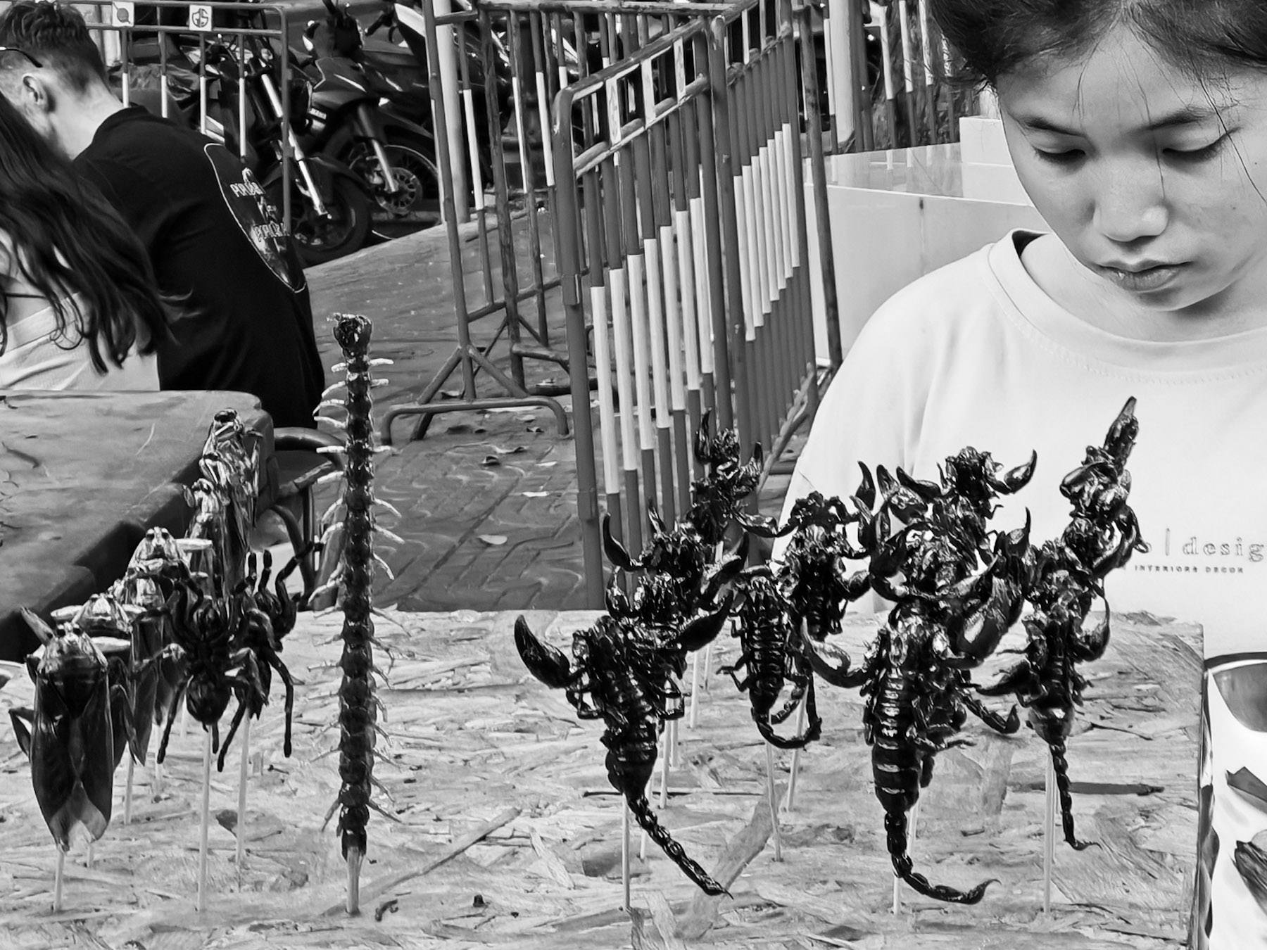 Schlangen, Skorpione, Alligatoren, Maden, Heuschrecken und Tausendfüßler; Tiere, die uns im ersten Moment den Atem rauben, die wir vielleicht nur aus Furcht und Staunen kennen, doch hier sind sie, auf den Tellern der Menschen, als Nahrung, als Medizin, als Mysterien der Natur, die den Hunger stillen. Bevor der Abscheu in uns aufsteigt, bevor der Blick verurteilt und der Finger auf die Unbekannten zeigt, sollten wir innehalten.