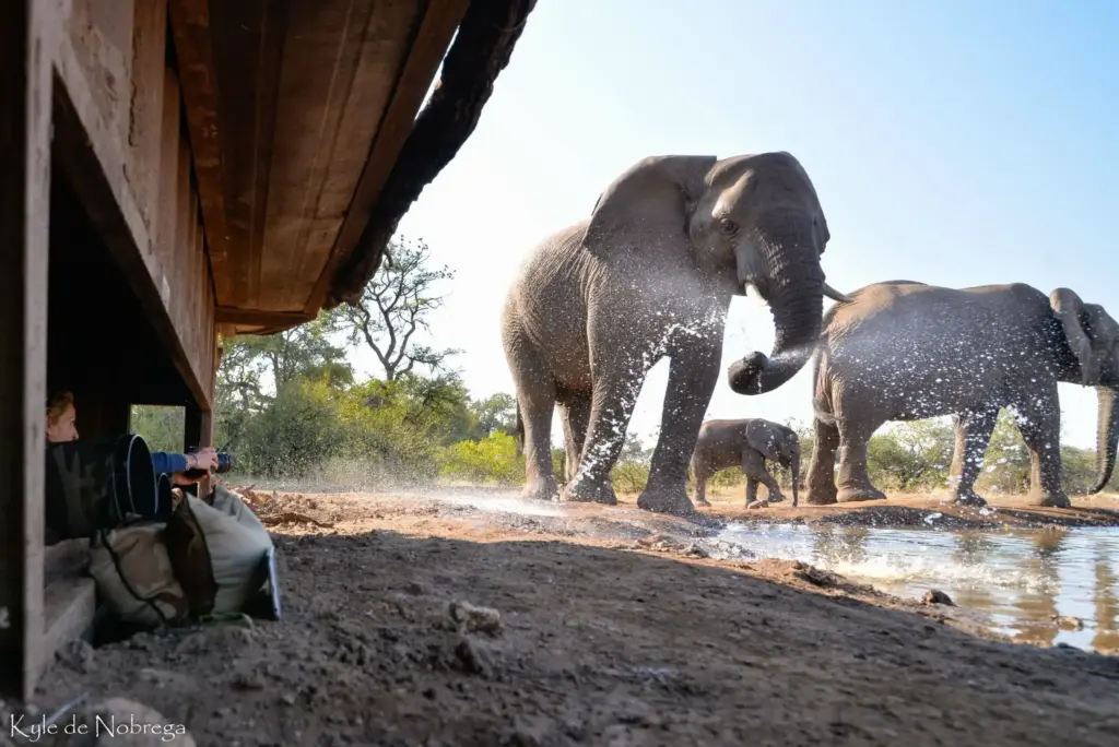 Das Versteck liegt an einer belebten Wasserstelle, die täglich von einer Vielzahl an Wildtieren und Vögeln aufgesucht wird. Doch das wahre Spektakel beginnt, wenn die Elefanten erscheinen – oft in großen Gruppen, majestätisch, neugierig und manchmal nur zwei Meter entfernt von Ihrer Kamera.