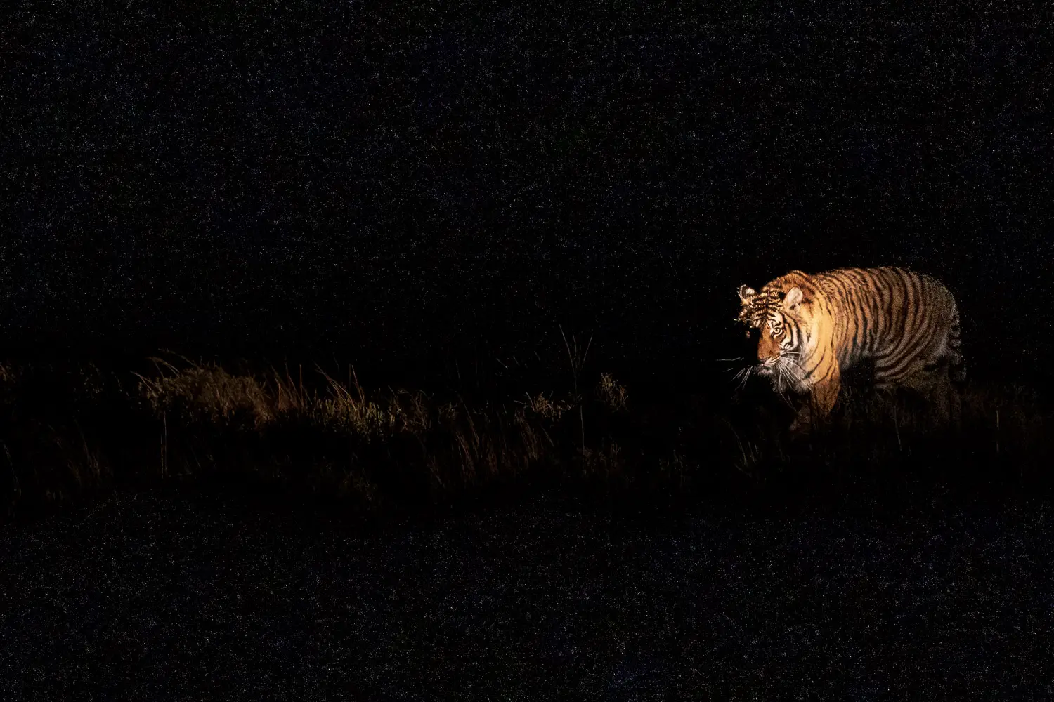 Die Möglichkeit, Tiger auch in der Nacht zu fotografieren – eine weltweit nahezu einmalige Gelegenheit. Dabei entstehen außergewöhnlich kreative, atmosphärische und rare Aufnahmen, die sonst kaum jemand woanders realisieren kann.