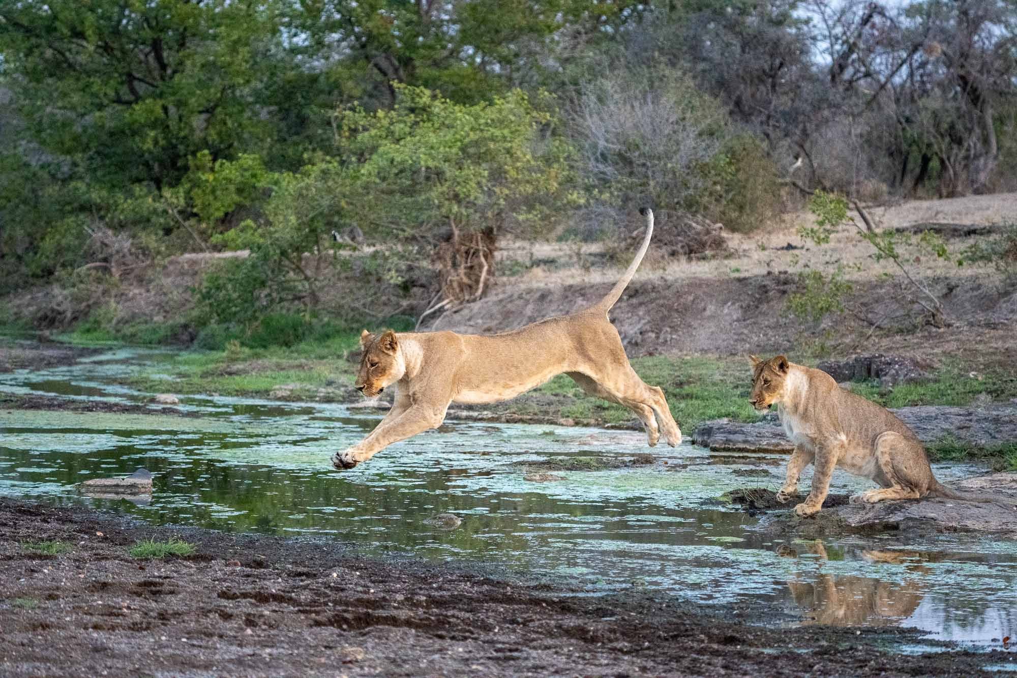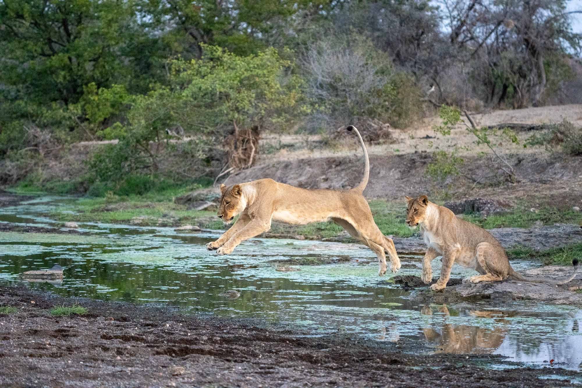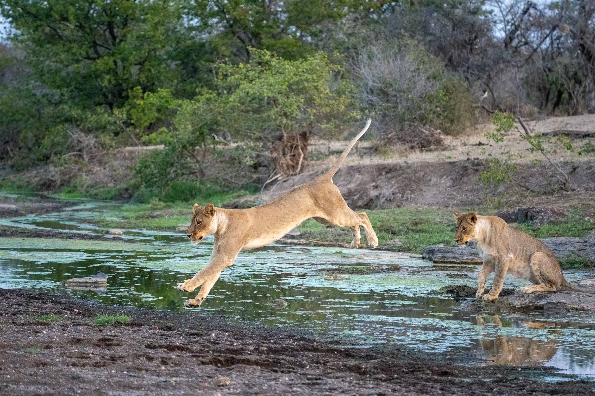Vor uns lag eine Löwenfamilie. Vier prachtvolle Tiere, die nach einer Ruhepause plötzlich aufstanden und zielstrebig auf einen schmalen Fluss zugingen. Wir hielten den Atem an. Dann geschah das, was man nur selten in freier Wildbahn zu sehen bekommt: Einer nach dem anderen sprang über das Wasser.