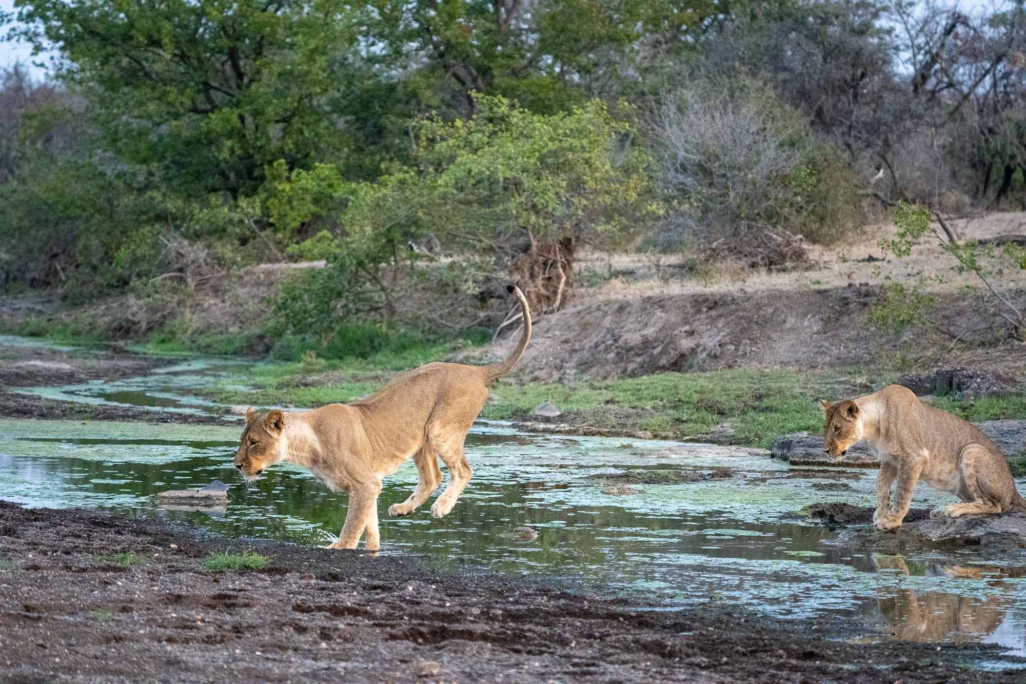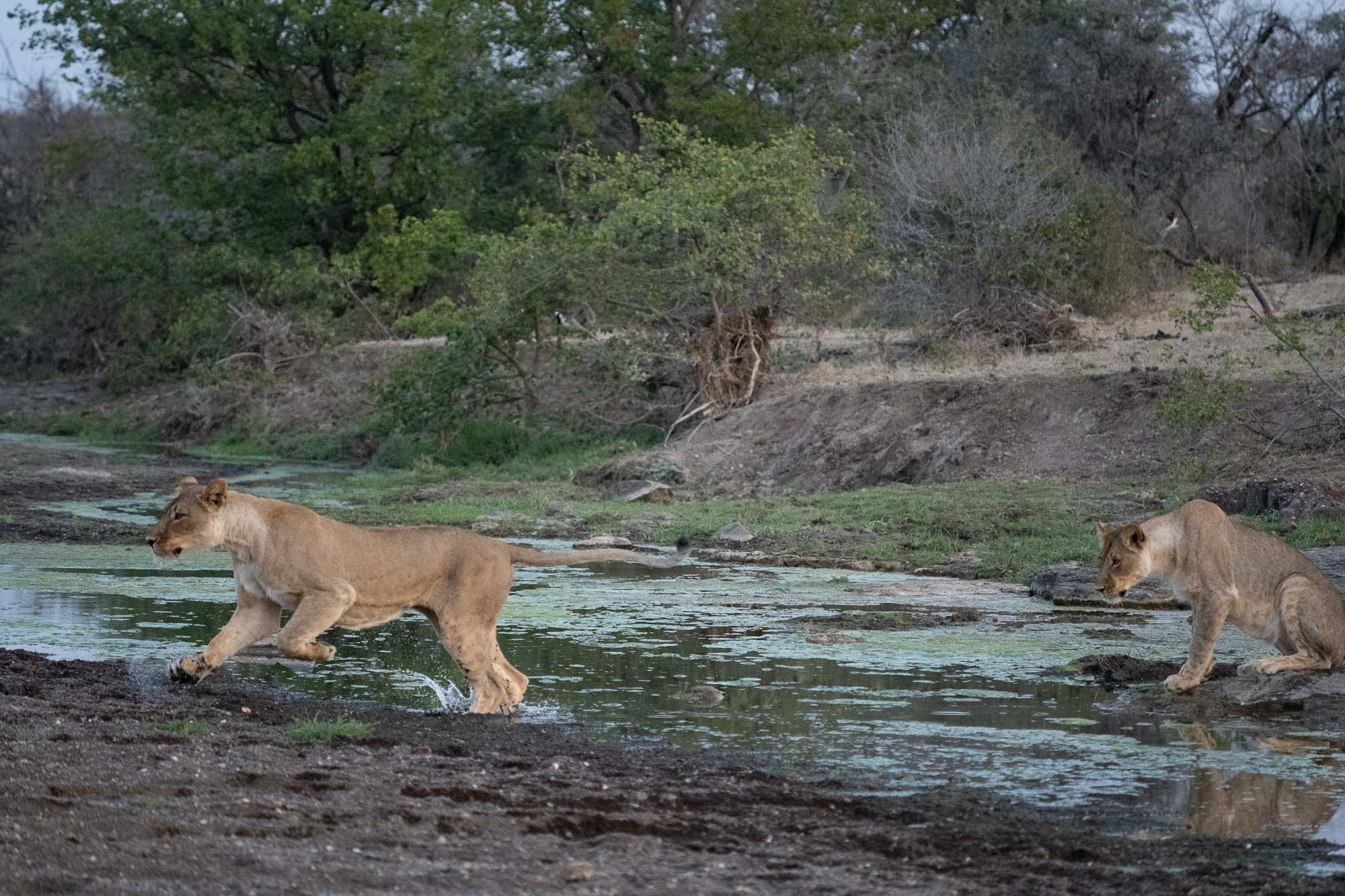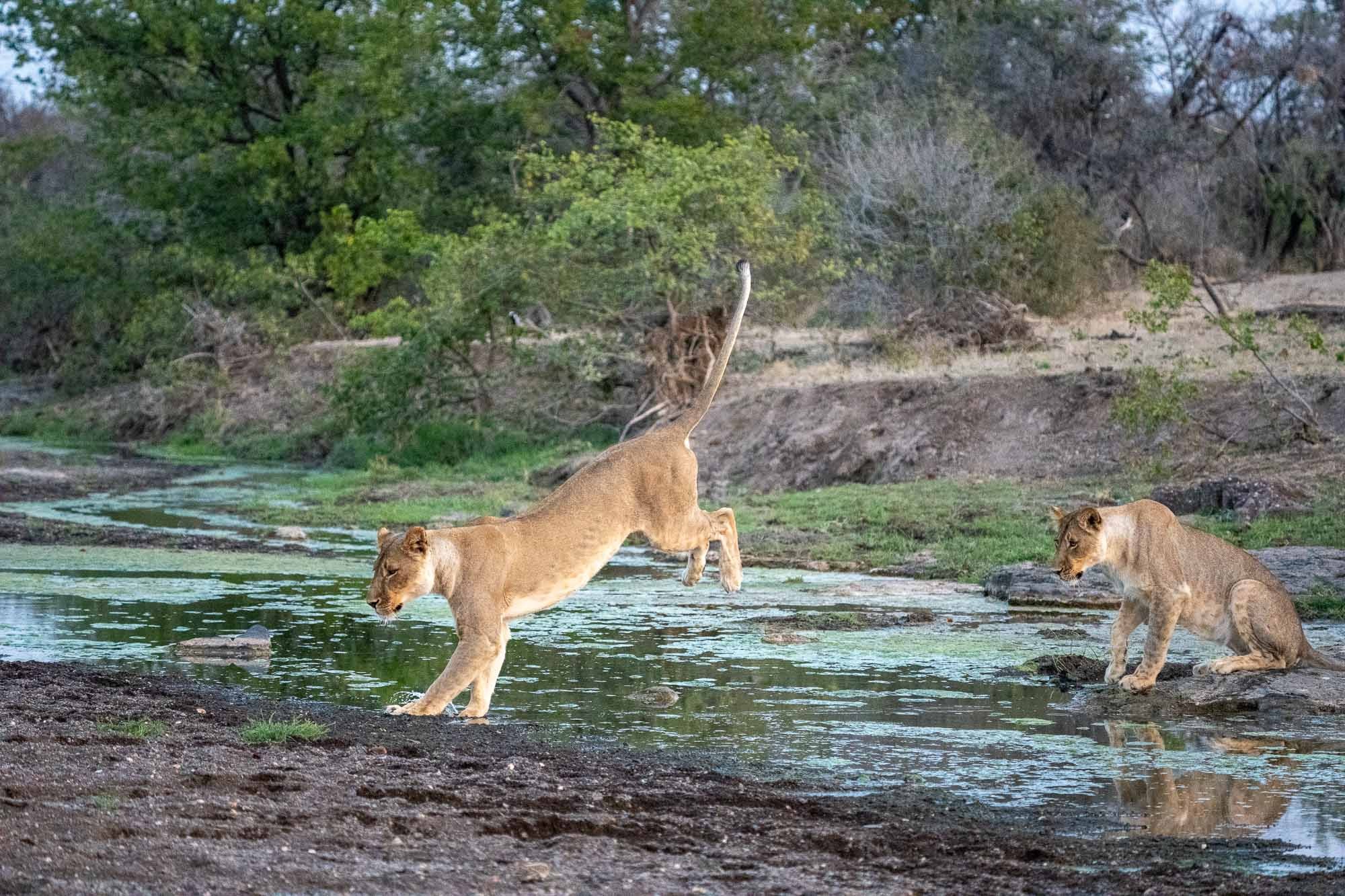 Vor uns lag eine Löwenfamilie. Vier prachtvolle Tiere, die nach einer Ruhepause plötzlich aufstanden und zielstrebig auf einen schmalen Fluss zugingen. Wir hielten den Atem an. Dann geschah das, was man nur selten in freier Wildbahn zu sehen bekommt: Einer nach dem anderen sprang über das Wasser.
