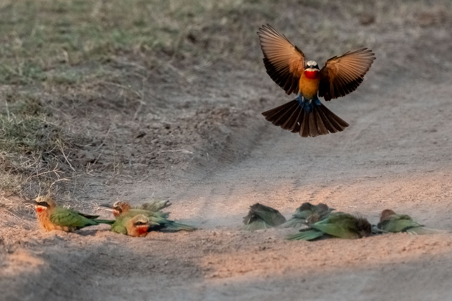 Die Sonne hing tief über der weiten Ebene des South Luangwa Nationalparks, als sich vor unseren Augen ein kleines Wunder entfaltete. Bunte Bienenfresser wirbelten durch den Staub, tanzten im goldenen Licht und schienen für einen Moment alles um sich herum vergessen zu haben. Ihr Gefieder leuchtete wie flüssiger Regenbogenstaub – ein Schauspiel, das uns staunen ließ, als wären wir plötzlich Teil eines lebendigen Gemäldes.