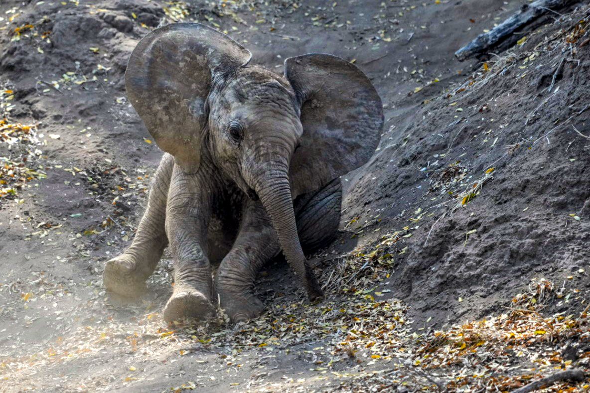 Ein Rutsch ins Abenteuer: Das Elefantenkind am Fluss Der erste Tag unserer Fotosafari in Botswana...