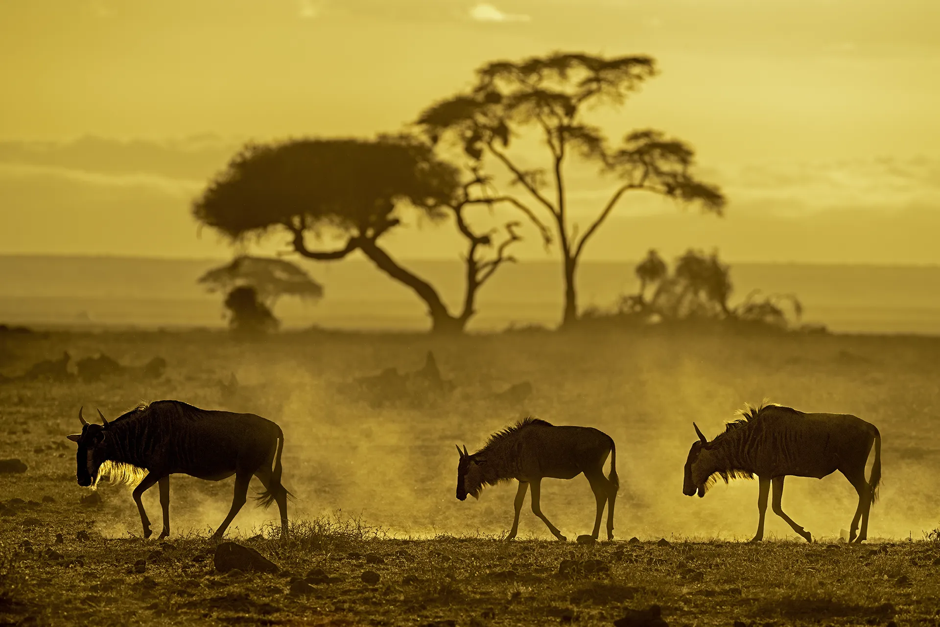 In den weiten Ebenen Afrikas, im goldenen Licht eines versinkenden Sonnenballs, ziehen drei Gnus in...