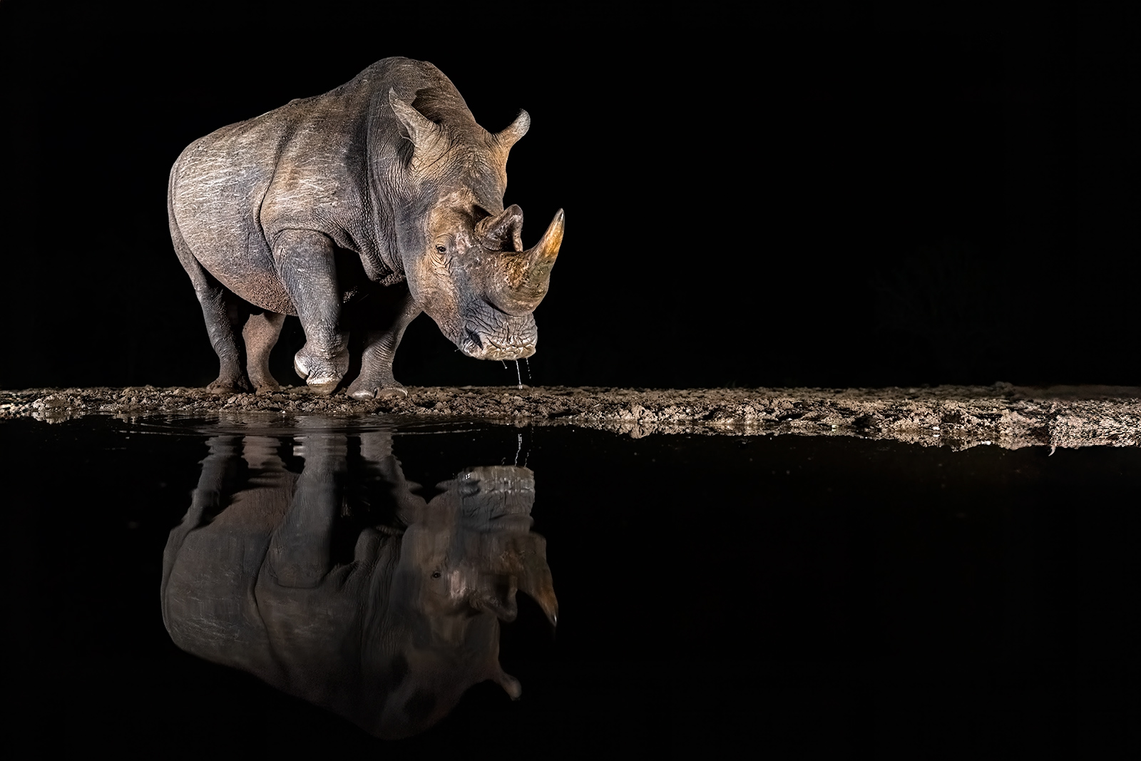 Ein atemberaubender Moment: Das Nashorn und seine Wasserreflexion In der tiefen Stille der afrikanischen Nacht,...